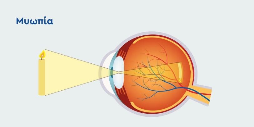 Η μυωπία συνήθως εκδηλώνεται όταν το αξονικό μήκος του ματιού είναι μεγαλύτερο από το φυσιολογικό ή όταν ο κερατοειδής ή ο κρυσταλλοειδής φακός του ματιού έχουν μεγαλύτερη διαθλαστική δύναμη από το φυσιολογικό. Έτσι το φως εστιάζεται μπροστά από τον αμφιβληστροειδή, και όχι πάνω σε αυτόν, με αποτέλεσμα να εμφανίζεται μια θολή εικόνα για τα μακρινά αντικείμενα.