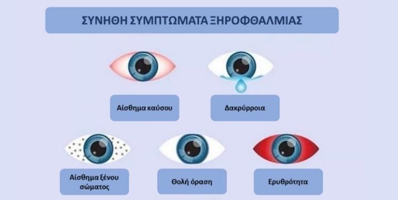 - Αίσθημα καύσου ή ξένου σώματος (σαν άμμος ή σκουπιδάκι)